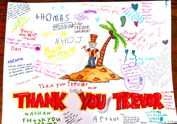 For maybe the 5th or 6th time, I lead a weekly games class in the Fall of 2012 for the Community Home School Group in Amherst MA. After my final class this time around, the kids presented me with a gift that included these 5 thank you cards on colored aluminum foil (side by side are front and back of the same one) along with a container of "organic home made vegan granola bars" the kids had made in cooking class and a fancy dark chocolate bar.