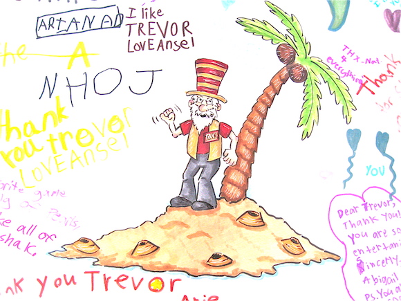 When my lovely wife was in library school, she did an internship at Hatfield Public Library in Hatfield MA. Her recommendation to the head librarian got me a gig there 7/20/10 entertaining a very lively group participating in the HPL Summer Reading Program. I got this large (12" x 17") delightful thank you note in the mail afterwards.